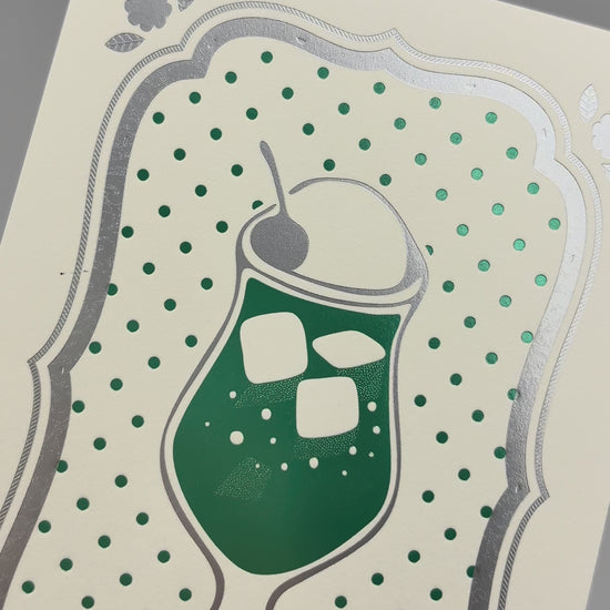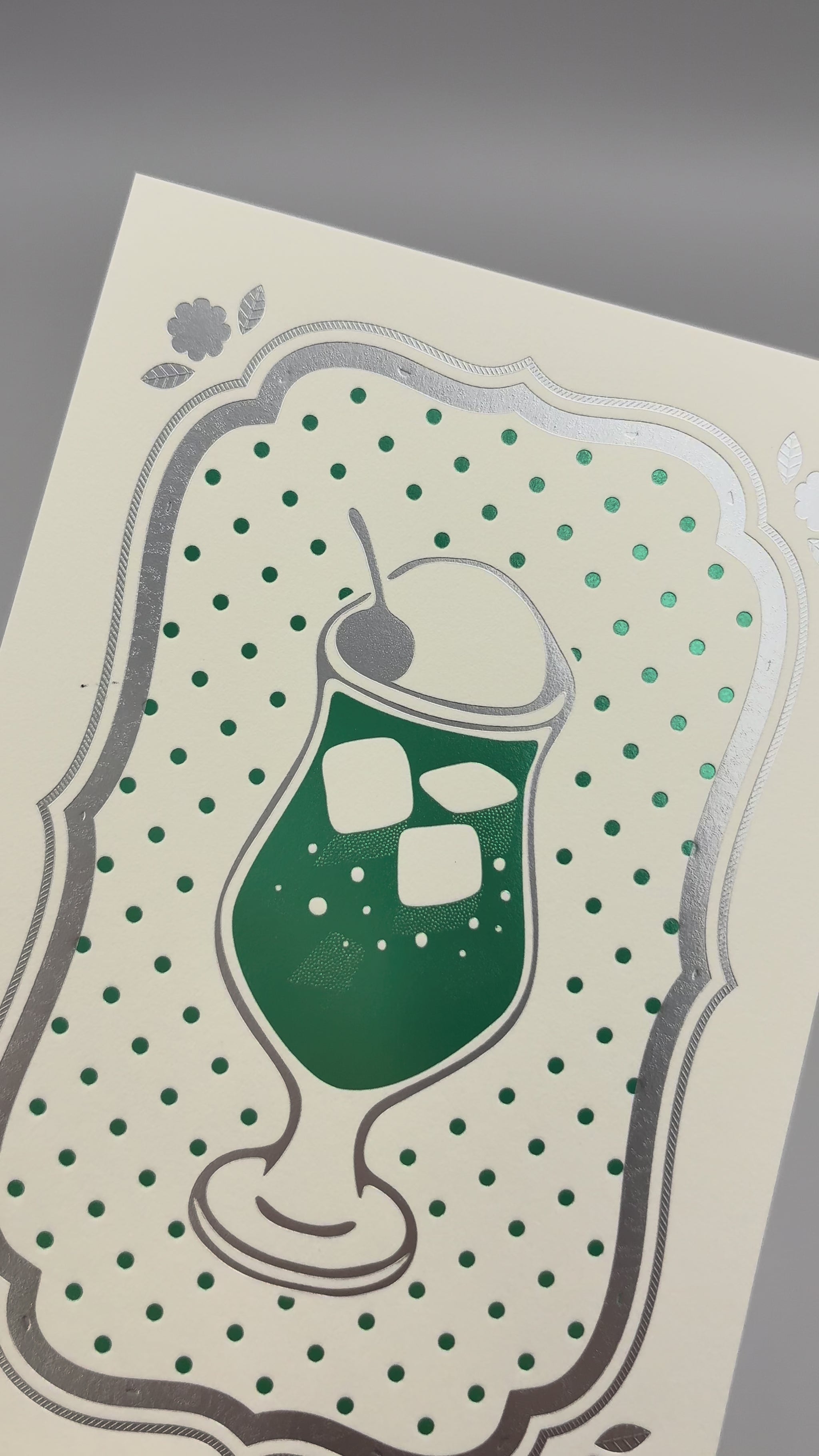Foil stamping is a technique that uses heat and pressure with a metal plate to transfer foil onto paper or other materials. By engraving a fine pattern into the plate, motifs such as frame patterns, soda ice, and cherries are given a three-dimensional effect and different colors are expressed.