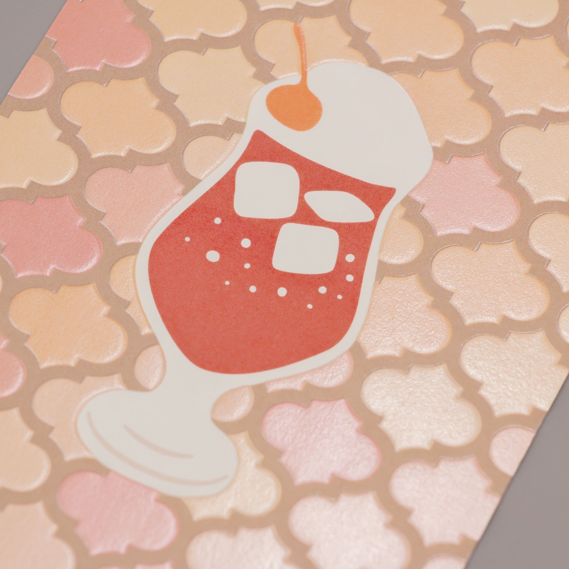 オフセット印刷の上にクリア箔を押し、さらに紙を裏側から押し上げる「浮き出し加工」を施すことで、モロッカンタイルの質感をリアルに再現。レトロでエキゾチックな雰囲気を演出しました。
