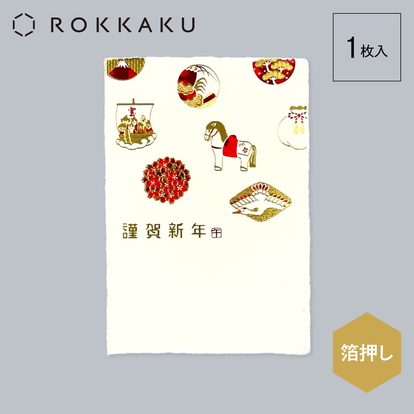 はがきには鳥の子紙を使用し、金箔や光によって変化して見えるホログラム箔などを施した豪華な年賀状です。