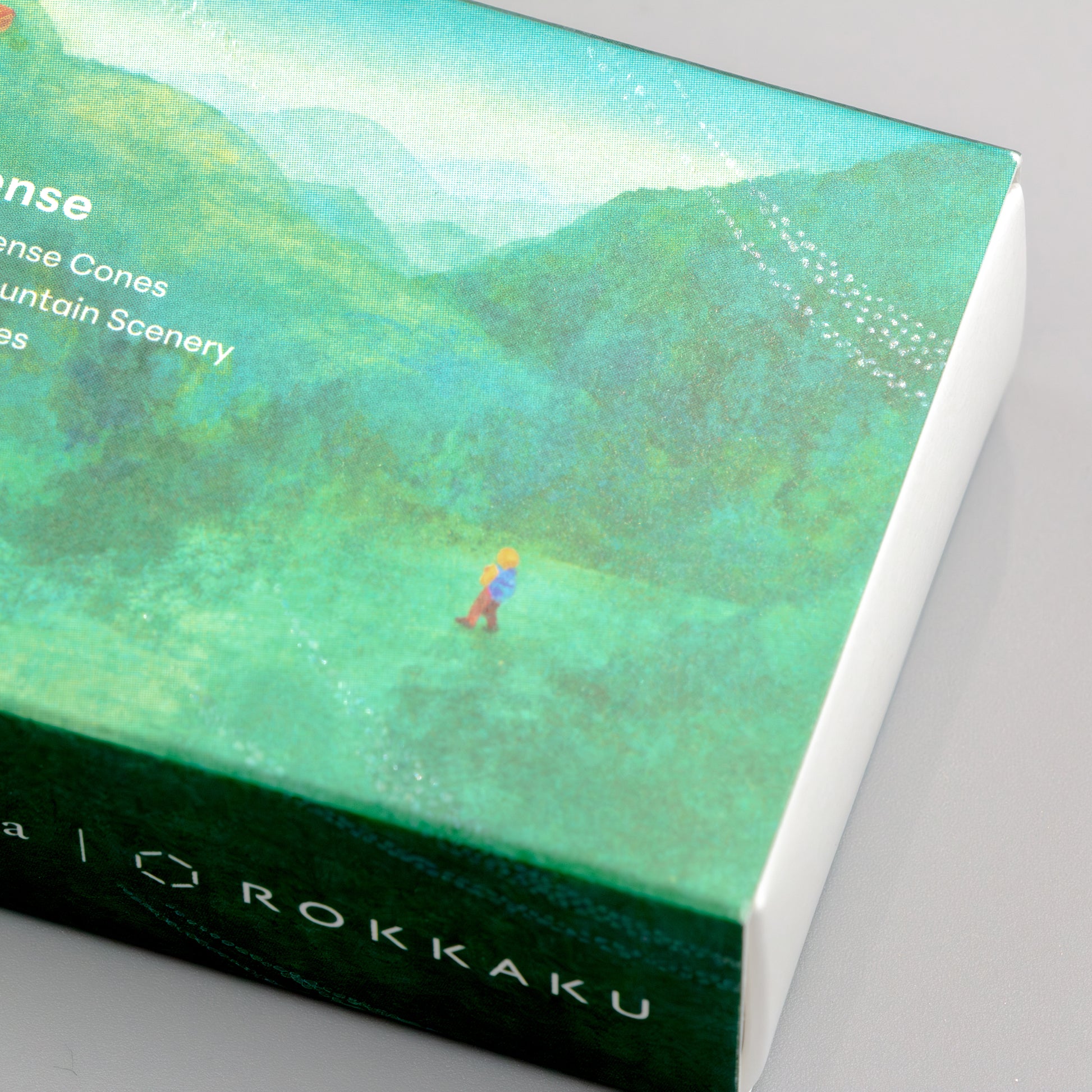 自然の香りで山の世界を旅するお香です。山にまつわる4つのシーンをご用意。パッケージには細やかなクリア箔を施し、漂う香りの空気感を表現しています。