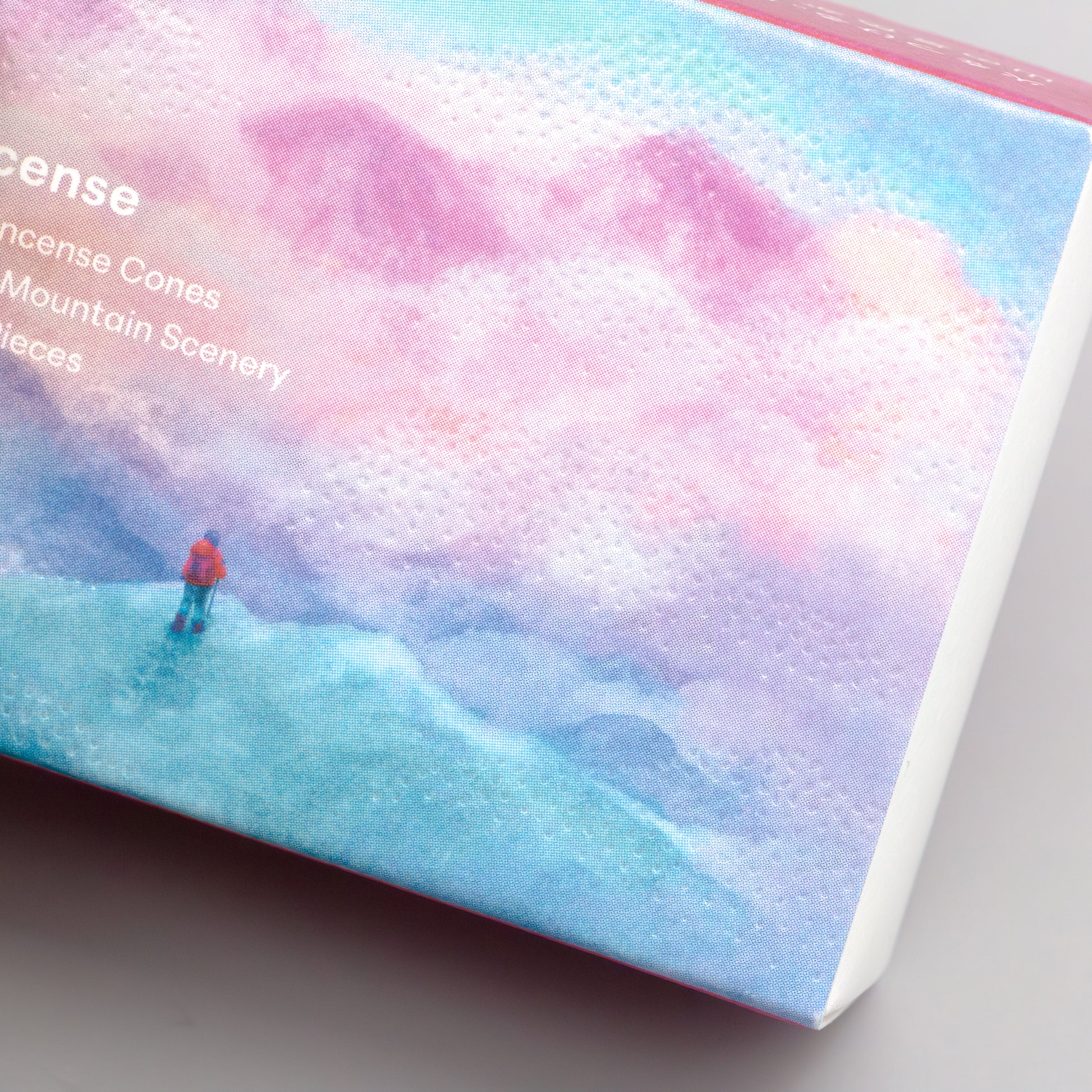 自然の香りで山の世界を旅するお香です。山にまつわる4つのシーンをご用意。パッケージには細やかなクリア箔を施し、漂う香りの空気感を表現しています。