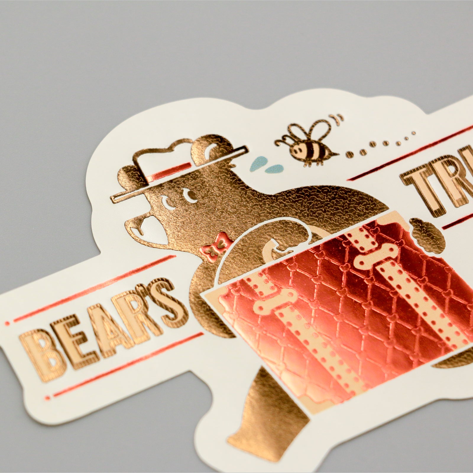 旅を続けるクマのワンシーンをキラキラと輝く箔押しが彩ります。