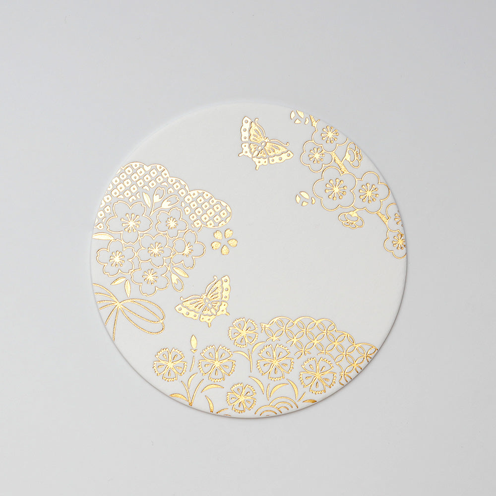 厚みのしっかりしたコースター用紙に、金の箔押しを施して和の吉祥柄を描いています。