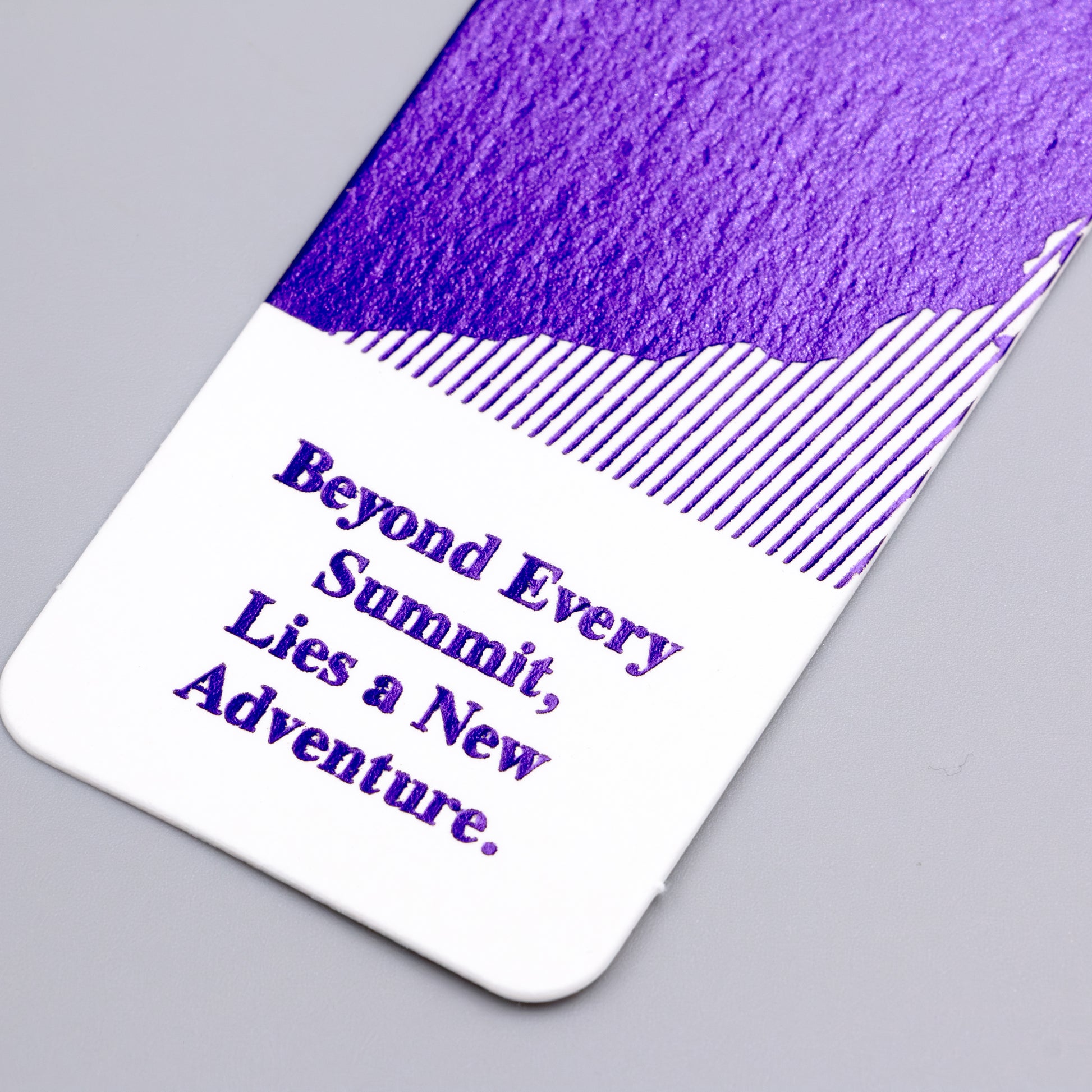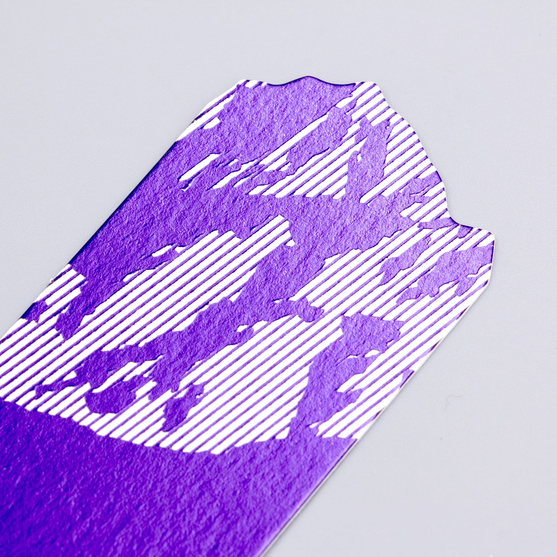 日本の四季が織りなす山のイメージを箔押し加工のみで表現した、デザイナーと職人のこだわりが詰まったしおりです。