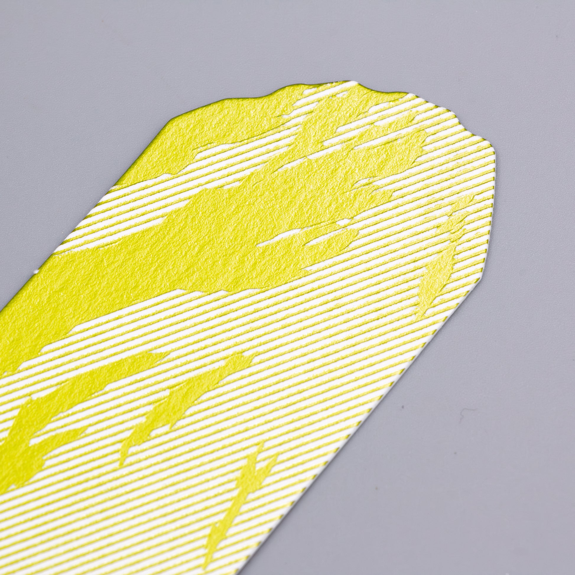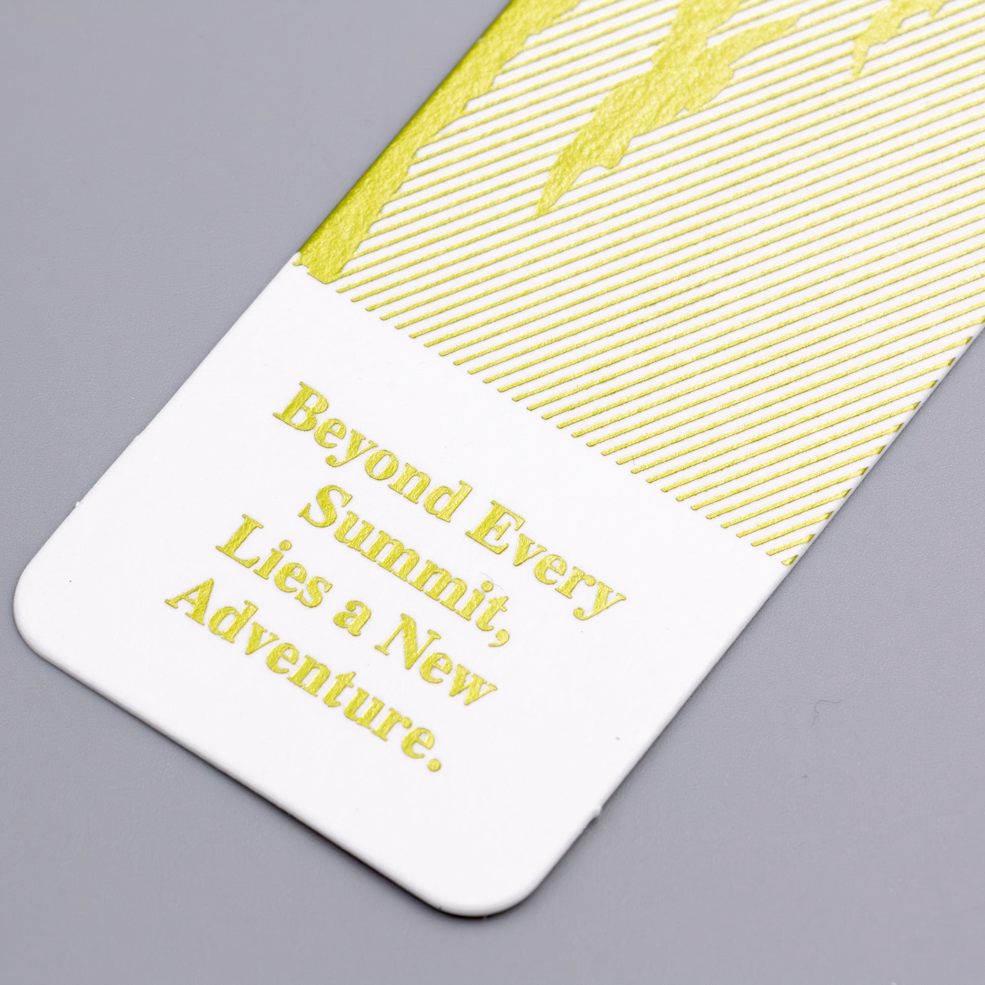 日本の四季が織りなす山のイメージを箔押し加工のみで表現した、デザイナーと職人のこだわりが詰まったしおりです。
