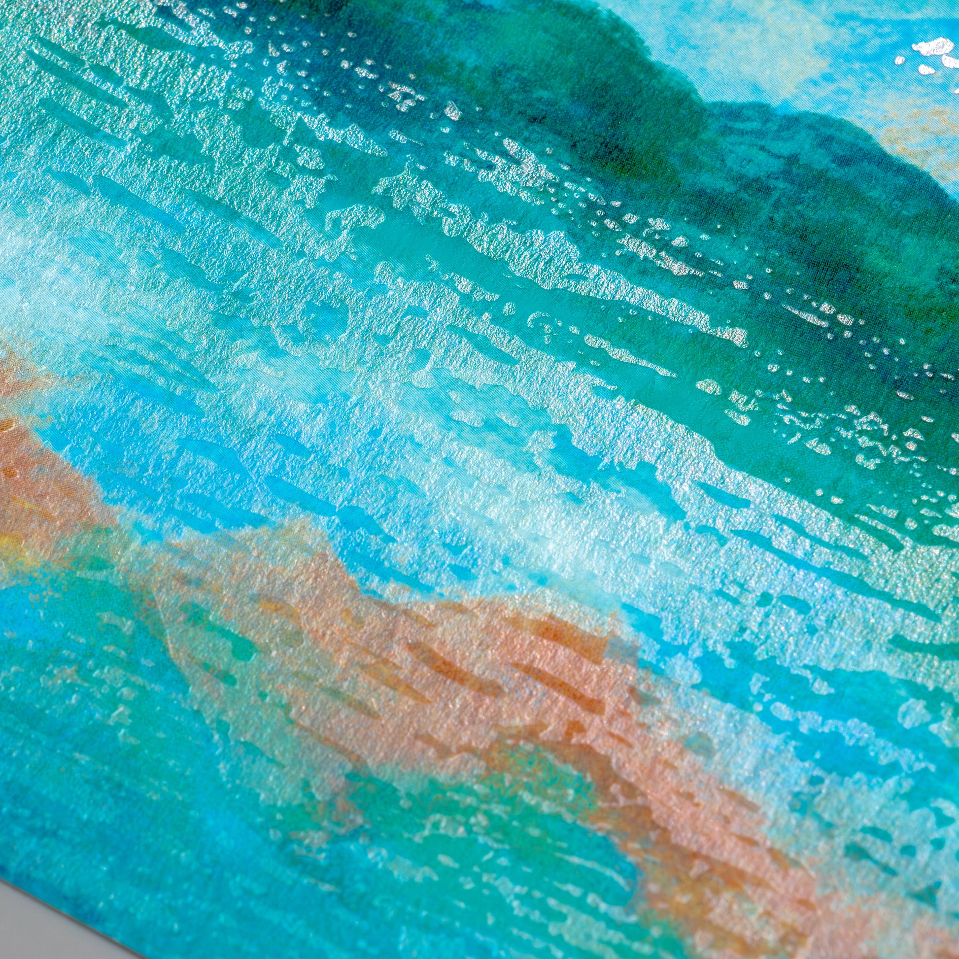 連なる山々を3つの異なる景色で描いています。山の凹凸感を際立たせるメタリックな箔と、大地や水面、雲海の質感をクリア箔で繊細に表現しました。