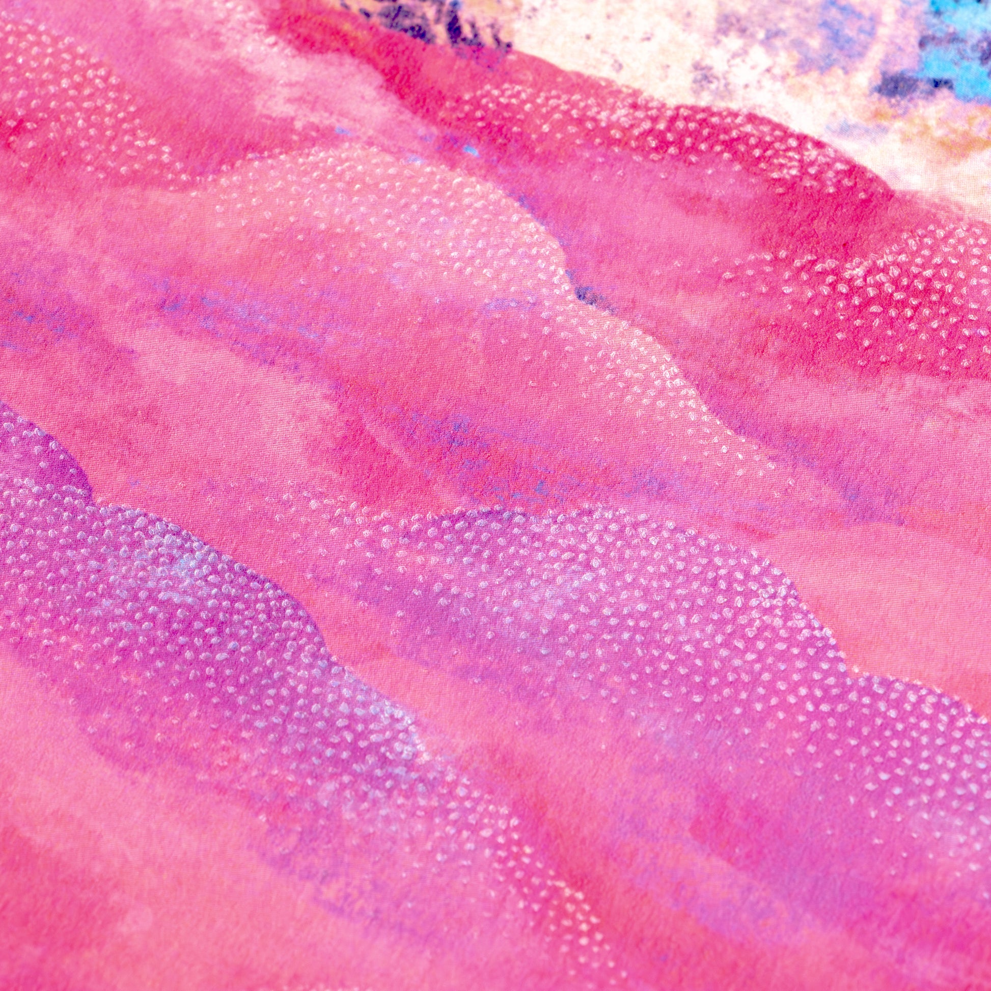 連なる山々を3つの異なる景色で描いています。山の凹凸感を際立たせるメタリックな箔と、大地や水面、雲海の質感をクリア箔で繊細に表現しました。